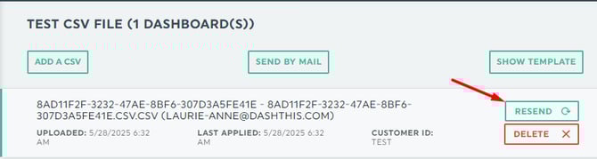 Une dernière chose : "Envoyer par courrier" est une fonction totalement différente de "Renvoyer", que vous trouvez à côté de chaque fichier CSV. La fonction "Envoyer par courrier" ajoute un nouveau fichier CSV à votre modèle, tandis que la fonction "Renvoyer" pousse les données de ce fichier CSV spécifique vers vos tableaux de bord.