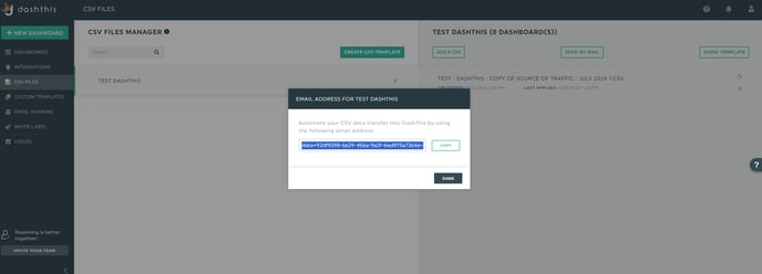 Lorsque vous cliquez sur le bouton, une fenêtre contextuelle s'affiche avec l'adresse électronique du destinataire que vous pouvez copier dans votre presse-papiers (le destinataire est une boîte aux lettres DashThis spécifique liée à votre modèle CSV). Vous pouvez coller cette adresse électronique dans un nouveau message dans votre gestionnaire de messagerie préféré, joindre le fichier CSV que vous souhaitez ajouter et cliquer sur "Envoyer". C'est tout, vous avez terminé !