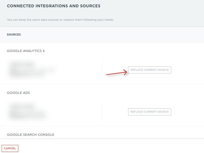 ⚠️ Note : Le nouveau compte doit avoir accès à la même source de données (par exemple, la même propriété Google Analytics, la même page Facebook, etc.