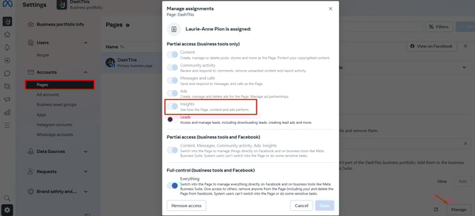 - Les autorisations Insights sont nécessaires pour que DashThis puisse accéder aux données d'Instagram Insights. Si vous n'avez pas accès aux rôles d'habilitation, veuillez contacter votre administrateur de compte.