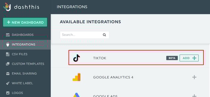Étape 2 - Faites défiler la liste des intégrations disponibles et cliquez sur AJOUTER + à côté de TikTok