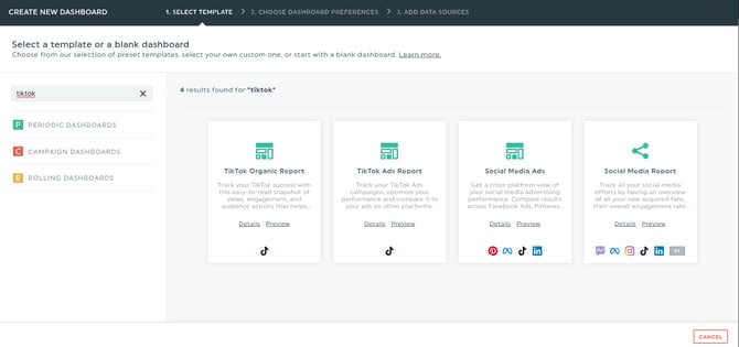 Vous pouvez désormais créer des rapports avec TikTok Organic 🙌 Vous ne savez pas quelles données importer ? Pas de problème ! Nous avons créé un modèle de tableau de bord périodique pour vous aider. Il suffit d'aller sur votre page Gestionnaire de tableau de bord et de cliquer sur Créer un tableau de bord, de rechercher parmi les modèles périodiques ou d'écrire le nom de l'intégration, et de trouver Reddit Ads Report.