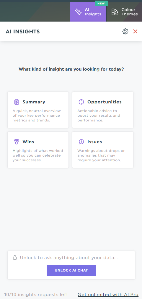 AI Insights Pro comprend deux modes avancés conçus pour vous aider à explorer vos données plus en profondeur : le mode Chat et le mode Contexte du tableau de bord.