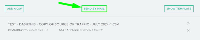 In the CSV files manager, when you select a CSV template, the button “Send by Email” appears in the header. This function allows you to send a CSV file by email instead of uploading it through our system. Just remember that you can only send a file to an already-existing template.