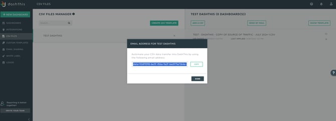 When you click the button, you’ll get a pop-up with the recipient’s email address that you can copy to your clipboard (the recipient is a specific DashThis mailbox linked to your CSV template). You can paste this email address into a new message in your preferred email manager, attach the CSV file you want to add and click “Send”. That’s it, you’re done!