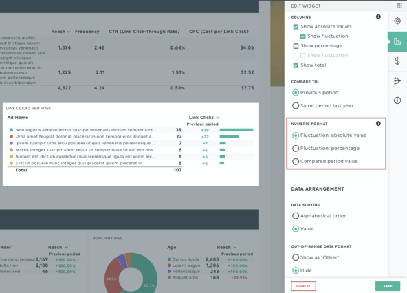 - If your data is increasing from one period to another, the fluctuation will likely be green with a "+" symbol in some widgets.
