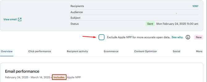 - The "Open Rate" metric we get via the API does not support the filter "Exclude Apple MPP for more accurate open data."