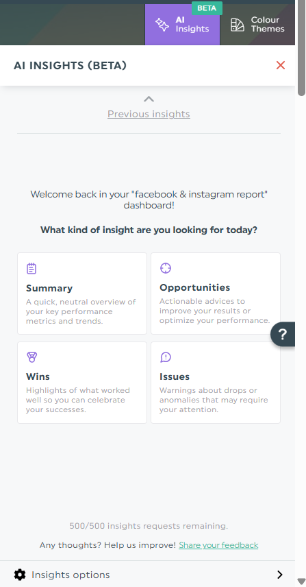 With just one click, AI Insights analyzes your dashboard data through four lenses every marketer needs:
