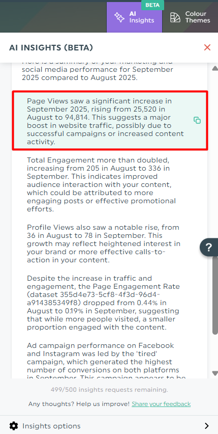 With AI Insights, DashThis brings you intelligent, automated commentary and analysis of your dashboard data. Rather than just pulling numbers, this feature helps you understand what the data means — so you can communicate insights, act on opportunities and demonstrate value more easily.